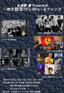 ぱんつぱん(スチールパン)/Graceful Life Singers (ゴスペル)/合田 礼 (ハープ弾き語り)/拵井加代子 (シャンソン)/Small Planets (ジャズ)/SKG45(器楽部OG)/Marimo Brothers (ソウル)