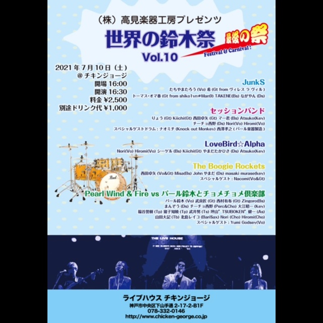 【JunkS】たちやまたろう(vo),希(gt fromヴィレス ラ ヴィル)、トーマス・オマ春(gt from shiko1yn≠Man9),TAKENE(b),ながやん(d)【セッションバンド】りょう(g)、Kiichi(g)、西田卓矢(g)、マー君(b)、Atsuko(key),チーチョ西野(d),Nori(vo),Hiromi(vo),スペシャルゲストドラム:ナオミチ(Knock out Monkey) 西澤孝之(パール楽器製造)【LoveBird☆Alpha】Nori(vo),Hiromi(vo),シーゲル(b),Kiichi(g),やまだたかひさ(d)、Atsuko(key)【The Boogie Rockets】 西田卓矢(vo&g),Misa(b),Johnやまだ(d),masaki murase(key)、スペシャルゲスト:Nacomi(vo&g) 【Pearl,Wind&Fire VS パール鈴木とチョメチョメ倶楽部】武良匠(gt),西村有布(gt),Zingoro(b),まんぞう(d),大江昭一(key),福谷誉樹(tp)、猪子知暁(tp),山田大記(tb),武井努(Ts),坪山”TSUBOKEN”健一(As),北島レイコ(Bs)、チーチョ西野(per&cho),Nori(cho),Hiromi(cho),パール鈴木(vo)、スペシャルゲスト:Yumi Godsey(vo)