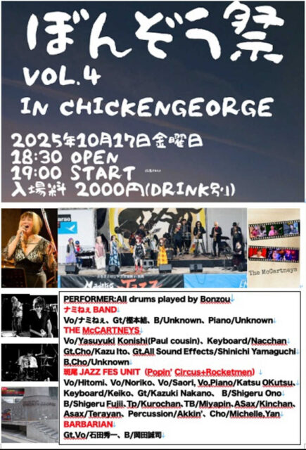 公演スケジュール Schedule 公演日でさがす 発売日でさがす ジャンルでさがす ✕ 当日券あり ぼんぞう祭 VOL.4 All drums played Bonzou ナミねぇBAND/斑尾JAZZ FES UNIT(Popin'Circus+ROCKETMEN)/THE MCCARTNEYS/バーバリアン/MC:ミシェル 2025/10/17(金) OPEN 18:30 / START 19:00整列順入場 / 自由席 チケットインフォメーション 前売価格 ¥2,000 (ドリンク代 ¥600 別途要) シェアする !