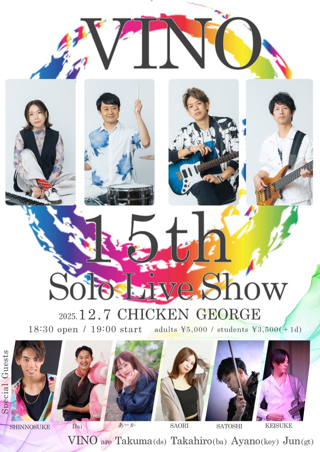 【VINO】 木村 琢磨 (Drums) 古賀 隆博(Bass) 板津 彩乃(Keyboard) 宮田 潤 (Guitar) ゲストメンバー 【Dancers】 SHINNOSUKE Dai あーか SAORI 【Musicians】 中塚哲司(Violin) KEISUKE(Guitar)
