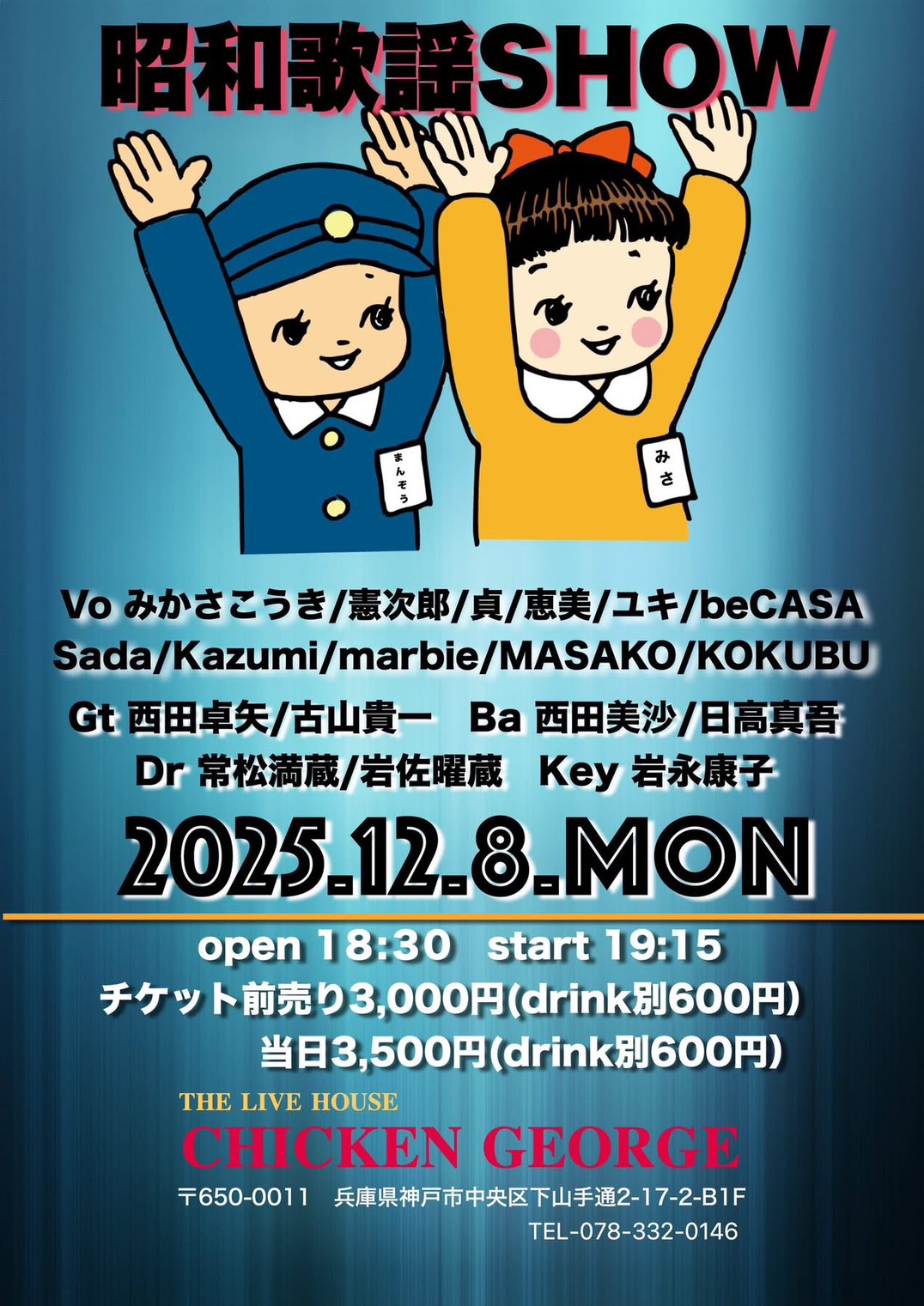 公演スケジュール Schedule 公演日でさがす 発売日でさがす ジャンルでさがす ✕ 当日券あり 昭和歌謡SHOW Voみかさこうき/憲次郎/貞/恵美/ユキ/beCASA Sada/Kazumi/marbie/MASAKO/KOKUBU Gt 西田卓矢/古山貴一 Ba 西田美沙/日高真吾 Dr常松満蔵/岩佐曜蔵 Key 岩永康子 2025/12/08(月) OPEN 18:30 / START 19:15整列順入場 / 自由席 チケットインフォメーション 前売券発売日 2025/11/20(木) 価格 ― シェアする !