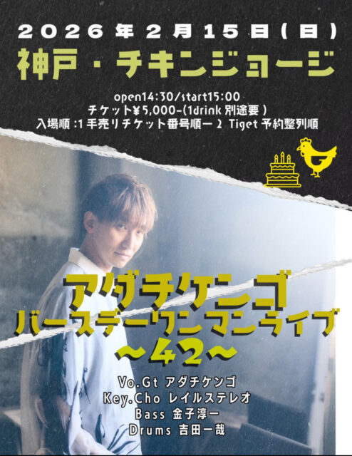 公演スケジュール Schedule 公演日でさがす 発売日でさがす ジャンルでさがす ✕ 当日券あり アダチケンゴバースデーワンマンライブ〜42〜 Vo.Gt アダチケンゴ Key.Cho レイルステレオ Bass 金子淳一 Drums 吉田一哉 2026/02/15(日) OPEN 14:30 / START 15:00整理番号順入場 / 自由席お問い合わせ:チキンジョージ 078-332-0146 チケットインフォメーション 前売券発売日 2025/12/05(金) 前売価格 ¥5,000 (ドリンク代 ¥600 別途要) シェアする !