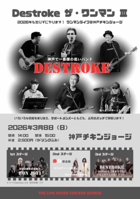 公演スケジュール Schedule 公演日でさがす 発売日でさがす ジャンルでさがす ✕ 当日券あり Destroke ザ・ワンマンⅢ Destroke 2026/03/08(日) OPEN 14:00 / START 15:00整列順入場 / 自由席お問い合わせ:チキンジョージ 078-332-0146 チケットインフォメーション 前売価格 ¥2,500 (1ドリンク付) シェアする !