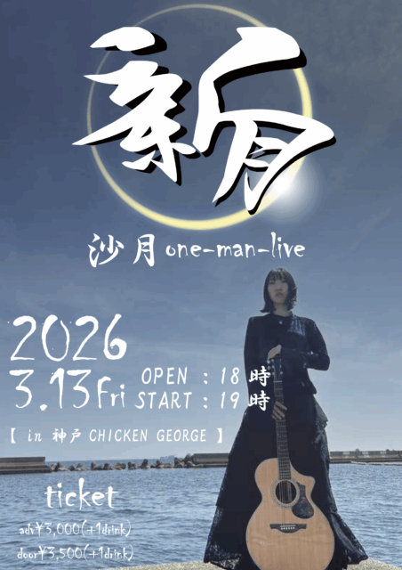 公演スケジュール Schedule 公演日でさがす 発売日でさがす ジャンルでさがす ✕ 当日券あり 沙月 one-man-live 新月 沙月 2026/03/13(金) OPEN 18:00 / START 19:00整列順入場 / 自由席お問い合わせ:チキンジョージ 078-332-0146 チケットインフォメーション 前売券発売日 2025/10/07(火) 19:00 前売価格 / 当日価格 ¥3,000 / ¥3,500 (ドリンク代 ¥600 別途要) シェアする !