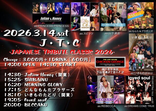 公演スケジュール Schedule 公演日でさがす 発売日でさがす ジャンルでさがす ✕ 当日券あり “J・T・C” -JAPANESE TRIBUTE CLASSIC 2026- Julian Honey(関東)/ SHIBAINU/ MORNING GLORY/ どんなもんだブラザーズ/ いきものたどり(関東)/ loved soul/ BECCAKU 2026/03/14(土) OPEN 14:00 / START 14:30整列順入場 / 自由席 チケットインフォメーション 前売価格 ¥3,000 (ドリンク代 ¥600 別途要) シェアする !