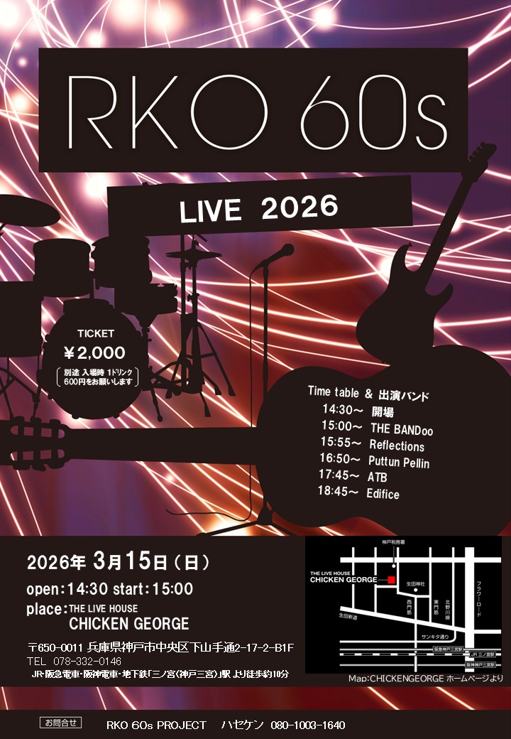 公演スケジュール Schedule 公演日でさがす 発売日でさがす ジャンルでさがす ✕ 当日券あり RKO 60s【2026】 THE BANDoo / Reflections / Puttun Pellin / ATB / Edifice 2026/03/15(日) OPEN 14:30 / START 15:00整列順入場 / 自由席 チケットインフォメーション 前売価格 ¥2,000 (ドリンク代 ¥600 別途要) シェアする !
