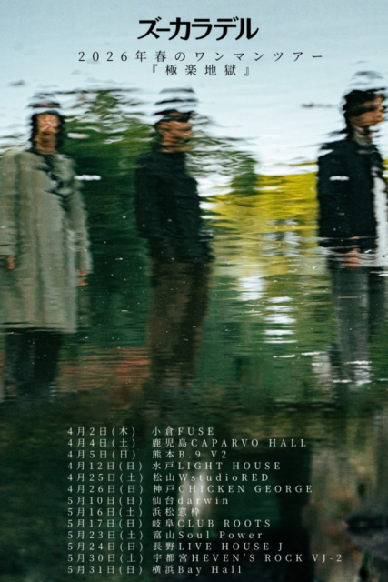 公演スケジュール Schedule 公演日でさがす 発売日でさがす ジャンルでさがす ✕ ズーカラデル 2026年春のワンマンツアー『極楽地獄』 ズーカラデル 2026/04/26(日) OPEN 17:00 / START 17:30整理番号順入場 / ALL STANDINGお問い合わせ:ョードーインフォメーション 0570-200-888 12:00~17:00 (日・祝 休み) チケットインフォメーション 前売券発売日 2026/03/07(土) 10:00 前売価格 ¥5,497 (ドリンク代 ¥600 別途要) プレイガイド ぴあ / ローチケ / e+ シェアする !