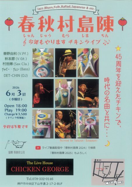 公演スケジュール Schedule 公演日でさがす 発売日でさがす ジャンルでさがす ✕ 当日券あり 春秋村島陳 春野由利(V.P.) 秋本節V.Gt.) 村地博(Sax) チャビー・チェン(Bass)/DET-CHIN(DJ) 2026/06/03(水) OPEN 18:00 / START 19:00整列順入場 / 自由席お問い合わせ:チキンジョージ 078-332-0146 ※ご予約不要 チケットインフォメーション 前売価格 ¥3,500 (ドリンク代 ¥600 別途要) シェアする !